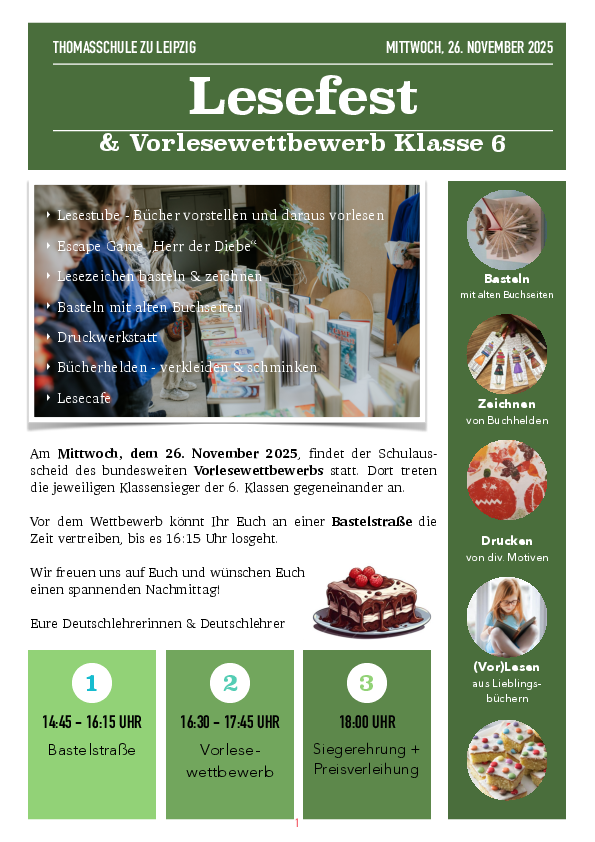 Am Nachmittag findet der Vorelsewettbewerb der 6. Klassen statt. Bis dahin könnt ihr zur Bastelsatrße und euch da kreativ austoben und ab und zu im Lesecafe stärken.