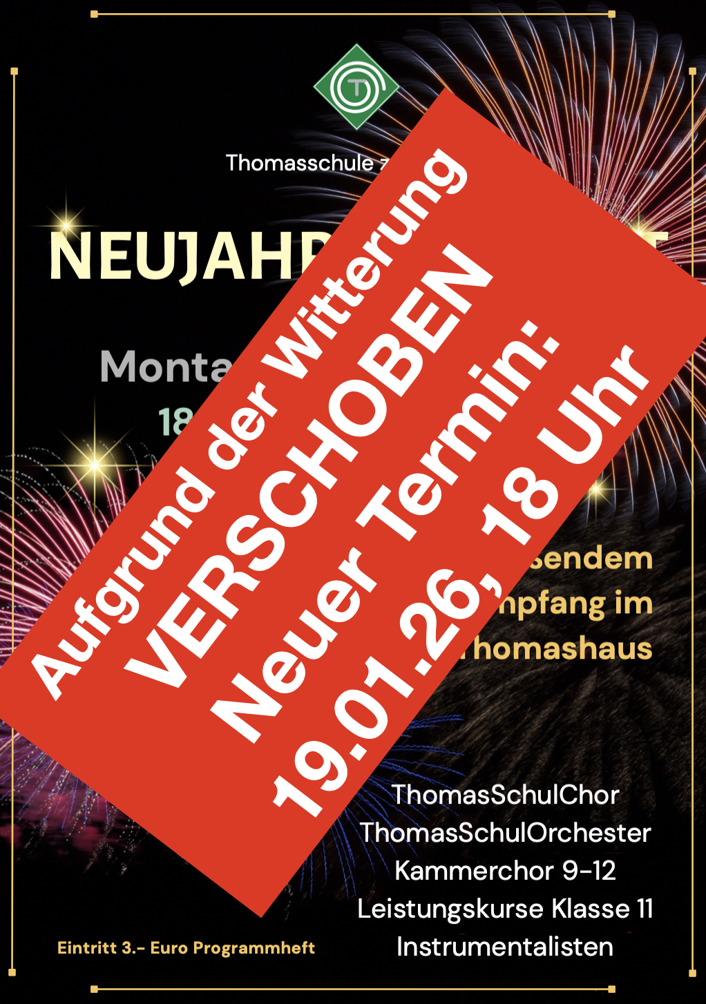 Achtung! Das Neujahrskonzert findet heute witterungsbedingt nicht statt! Dafür aber am 19.01. um 18 Uhr.