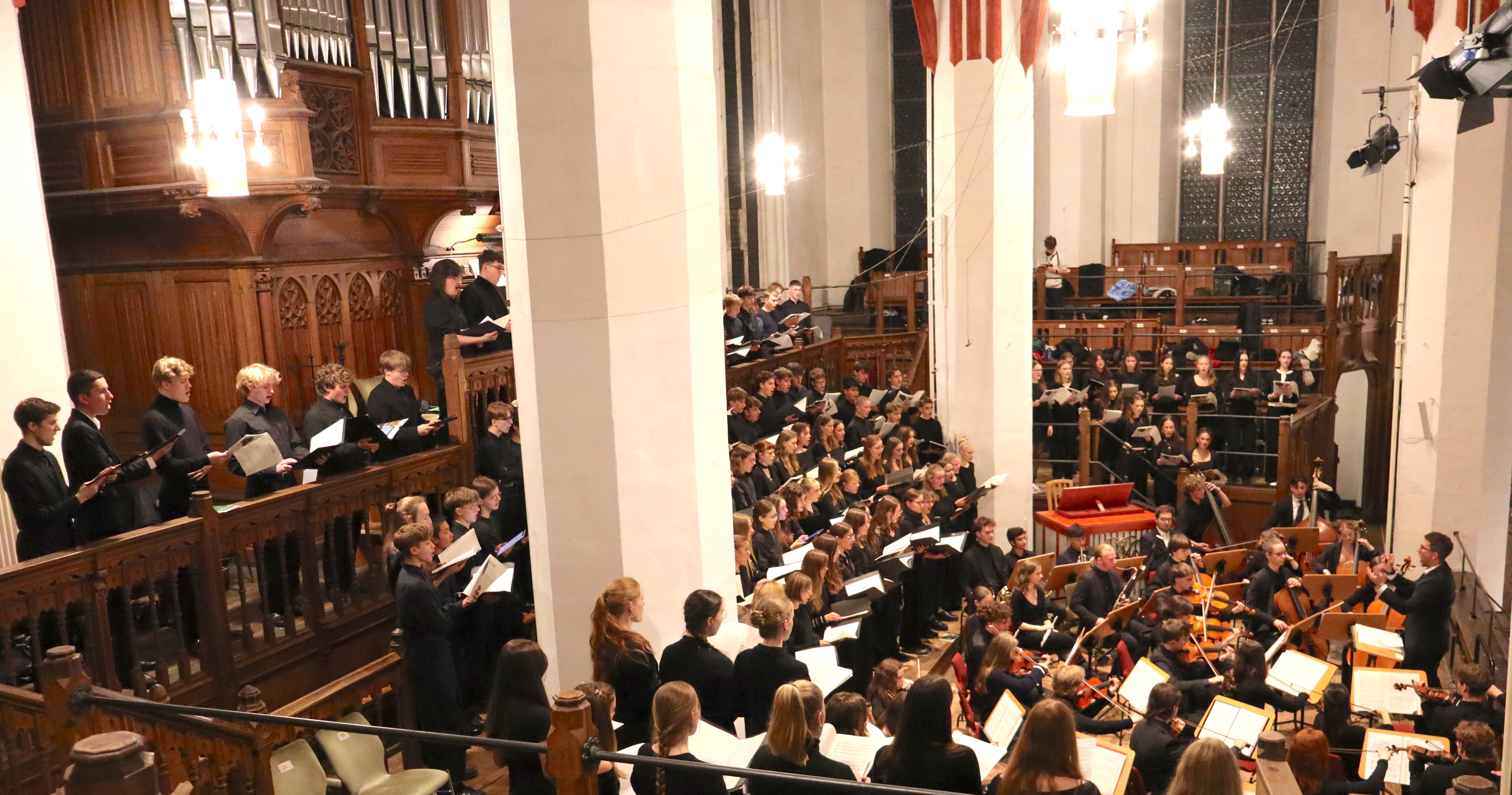 Nicht nur der ThomasSchulChor, der KammerChor9-12 und das ThomasSchulorchester wirkten gemeinsam auf der geschichtsträchtigen Chorempore der Thomaskirche zusammen. Sie wurden durch 50 ehemalige Choristen und Instrumentalisten sowie Eltern aktiver Schülerinnen und Schüler unterstützt. Somit sangen und spielten 200 Musikbegeisterte ein Requiem, welches in den Proben im Rahmen des Unterrichts aber auch in den intensiven Probenstunden am 31.10. und 1.11. zusammengesetzt und erarbeitet wurde. Zum Schluss erklangen fast 40 Minuten tief ergreifende Musik, die sich bspw. abwechselte zwischen warmherziger Tiefe der Streicher des Intriotus, der Klarheit und Urgewalt der Blechbläser im Dies Irae und der Zartheit der angepassten Harfenstimme für Querflöte und Violinen mit einem in der sinfonischen Kompositionsfassung aus dem Jahr 1900 immerwährenden Orgelfundament. Wenn man den Zuhörenden am Ende des Konzertes Glauben schenken darf, so haben es die Chöre und das Orchester geschafft, eben den angesprochenen Himmel und Erde mit Herrlichkeit zu fluten.