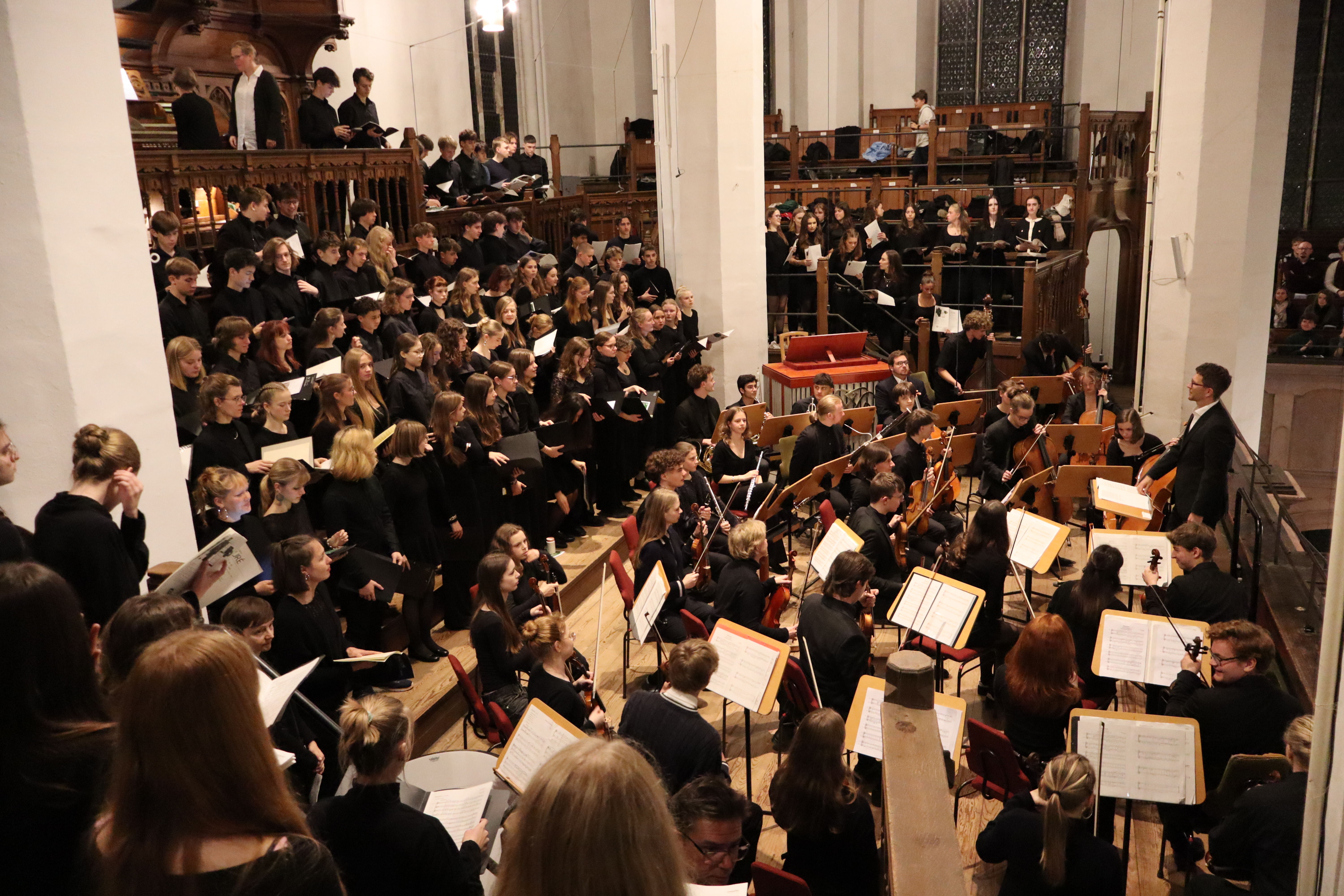 Nicht nur der ThomasSchulChor, der KammerChor9-12 und das ThomasSchulorchester wirkten gemeinsam auf der geschichtsträchtigen Chorempore der Thomaskirche zusammen. Sie wurden durch 50 ehemalige Choristen und Instrumentalisten sowie Eltern aktiver Schülerinnen und Schüler unterstützt. Somit sangen und spielten 200 Musikbegeisterte ein Requiem, welches in den Proben im Rahmen des Unterrichts aber auch in den intensiven Probenstunden am 31.10. und 1.11. zusammengesetzt und erarbeitet wurde. Zum Schluss erklangen fast 40 Minuten tief ergreifende Musik, die sich bspw. abwechselte zwischen warmherziger Tiefe der Streicher des Intriotus, der Klarheit und Urgewalt der Blechbläser im Dies Irae und der Zartheit der angepassten Harfenstimme für Querflöte und Violinen mit einem in der sinfonischen Kompositionsfassung aus dem Jahr 1900 immerwährenden Orgelfundament. Wenn man den Zuhörenden am Ende des Konzertes Glauben schenken darf, so haben es die Chöre und das Orchester geschafft, eben den angesprochenen Himmel und Erde mit Herrlichkeit zu fluten.